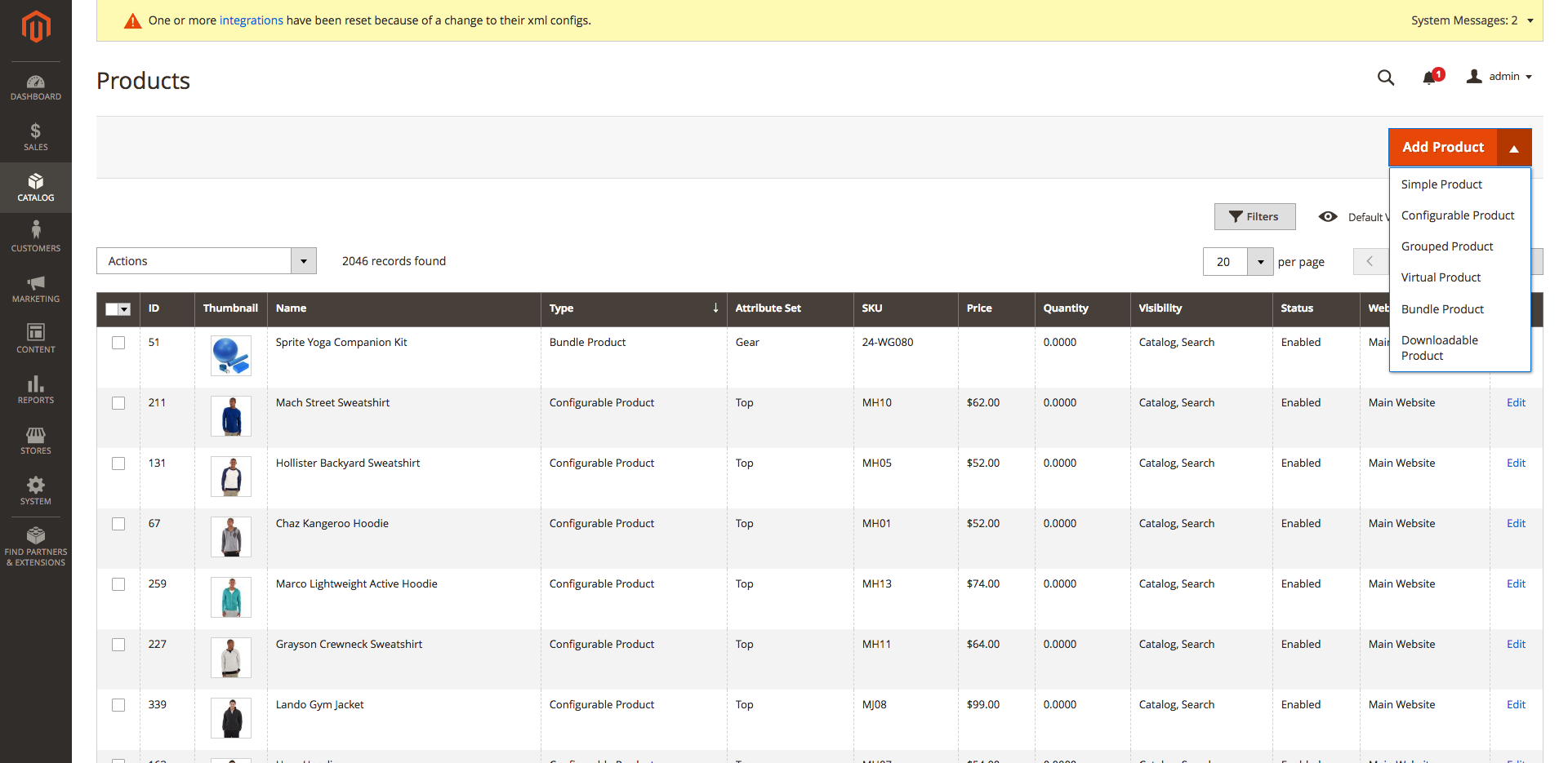 The simple product is the most simple product in Magento. To create one, log-in to the admin panel and go to Catalog->Products. We already have a good number of products in our store from the sample data, but we want to add a new product.
